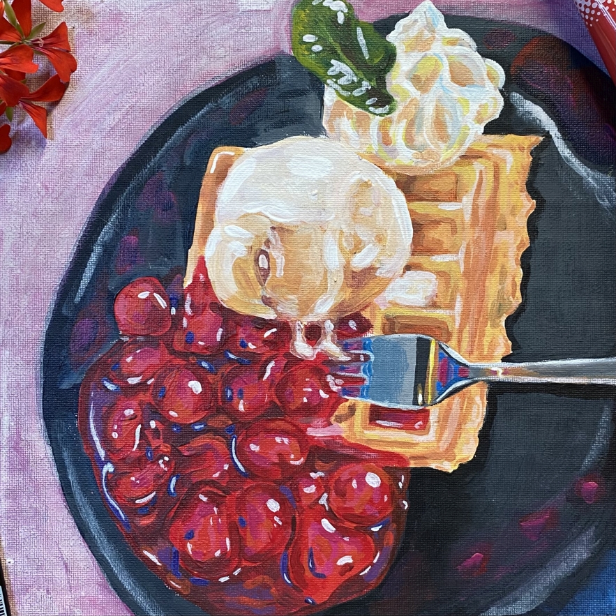 Ich male vor allem mit Acryl-, Öl- und Aquarellfarben, aber auch zwischendurch digital mit meinem iPad. Meine Bilder sind meist farbintensiv und bunt und inhaltlich male ich vor Allem Dinge, die mich glücklich machen oder mir in irgendeiner Form begegnen und mich zu einem Bild inspirieren. In vielen Fällen läuft es darauf hinaus, dass ich Essen male.